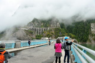 立山ロープウェイでは,また雨と霧になり,せっかくの紅葉がほとんど見れませんでしたが,黒部ダムでは,雨もやみ,ダム堤体上や上のダム展望台,下の新展望広場など往復とも外階段で廻れました。(ダム展望台や新展望広場へは階段が多く相当の体力が必要です。普段の運動不足が身にしみます。四国香川の「こんぴらさん」(金刀比羅宮)の階段にせまるほどの疲労感があります。)
