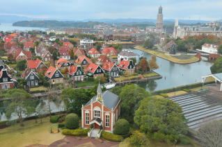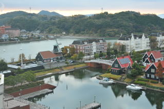 駅までの橋から見た宿泊ホテルとハウステンボス駅