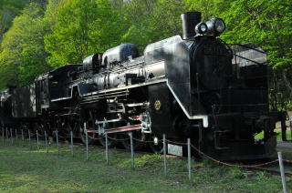 新内駅跡は,狩勝高原SL広場として整備されており,SL59672と20系寝台車3両が展示されており,SL運転席に入ることもできました。 |